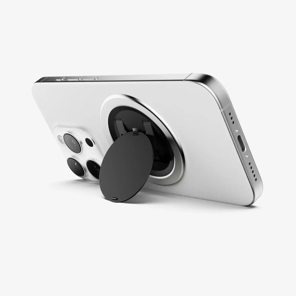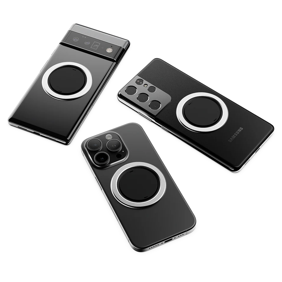 Grip. Stand. Charge. Stick. Works on all phones. MagSafe® compatible with wireless charge-through. Designed to match the look and feel of your expensive a$$ phone and thinner than your camera bumps so you won’t snag it on your pockets. Plus, it’s magnetic so you can mount it anywhere.
